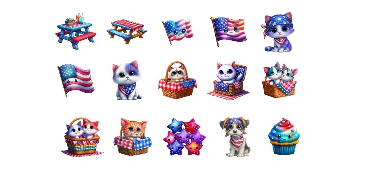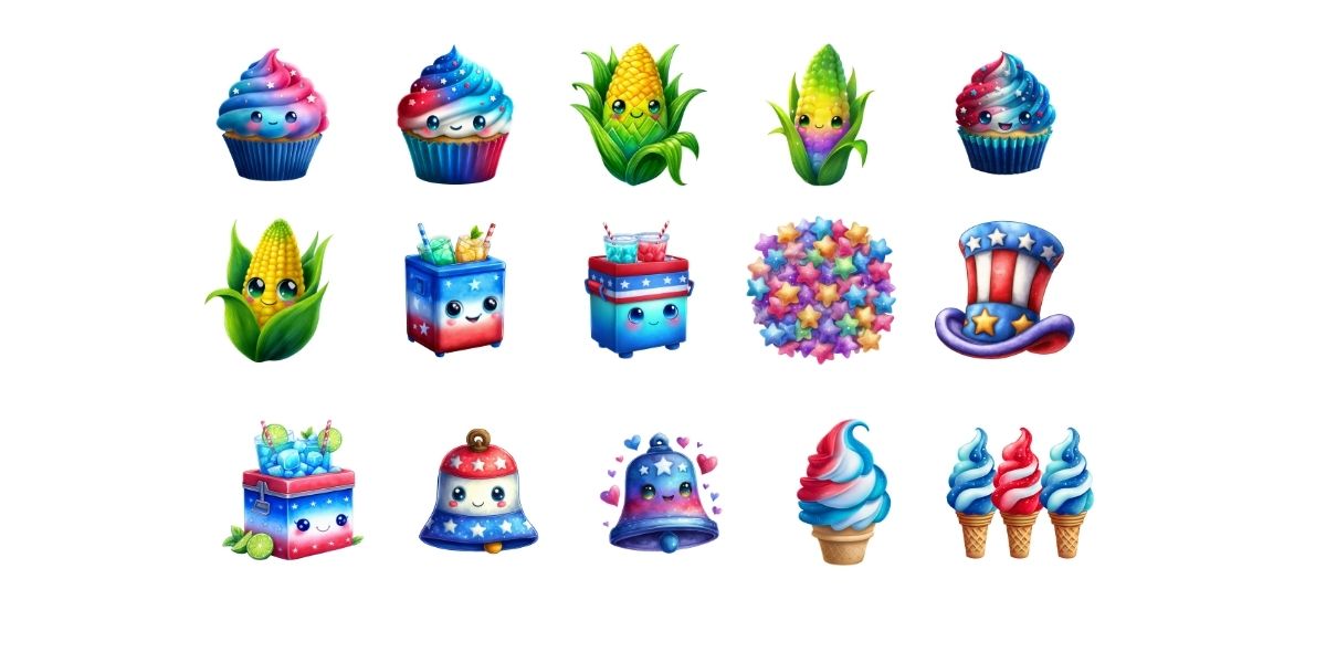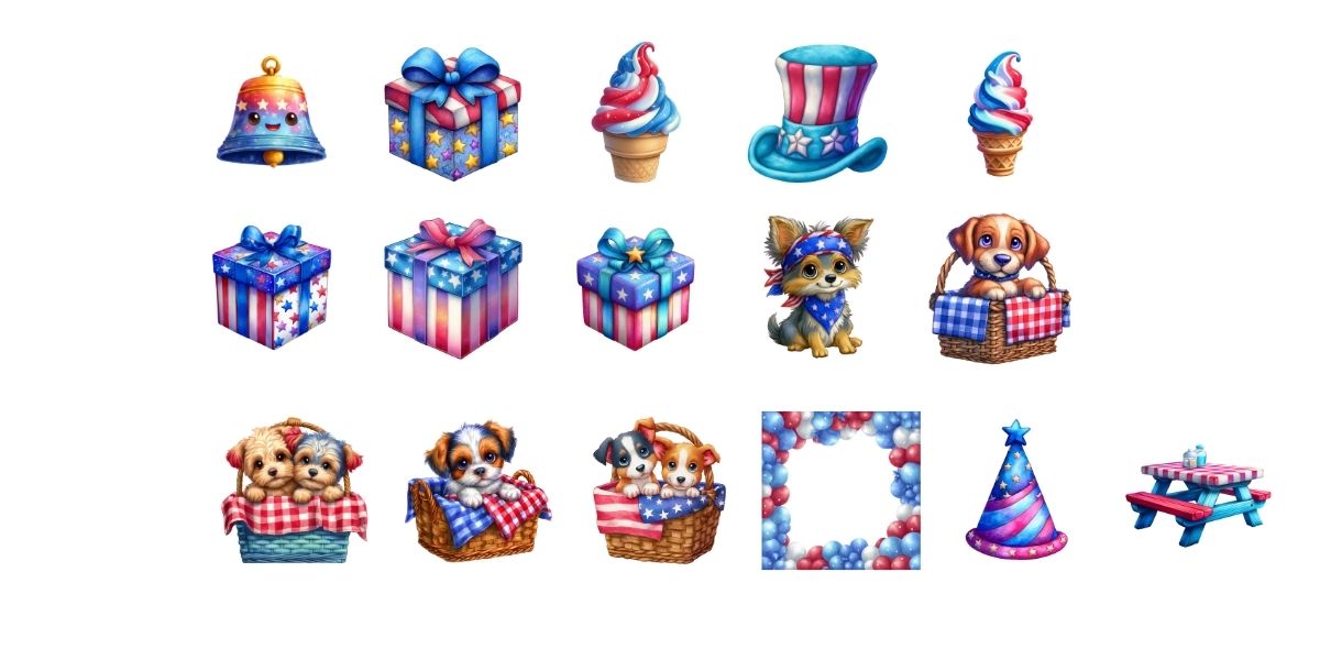 This is a set of 46 patriotic images, in a color scheme of red, white and blue. Images include hats, flags, ice cream and more. These were designed in Midjourney.