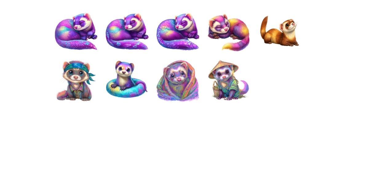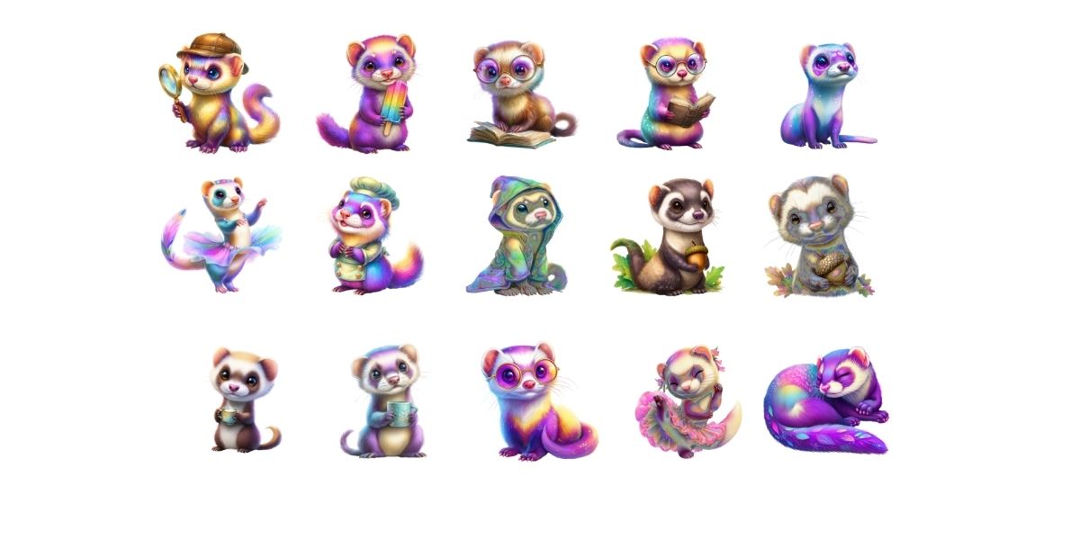 This is a set of 24 cute ferret images, in a harmony of colors. These were designed in Midjourney.