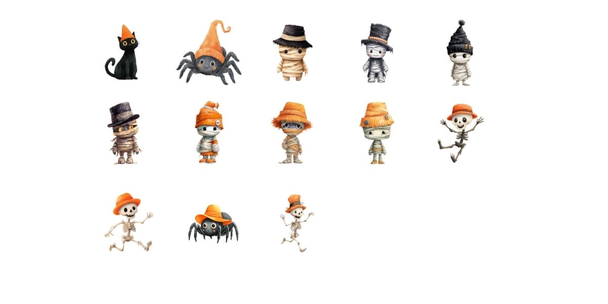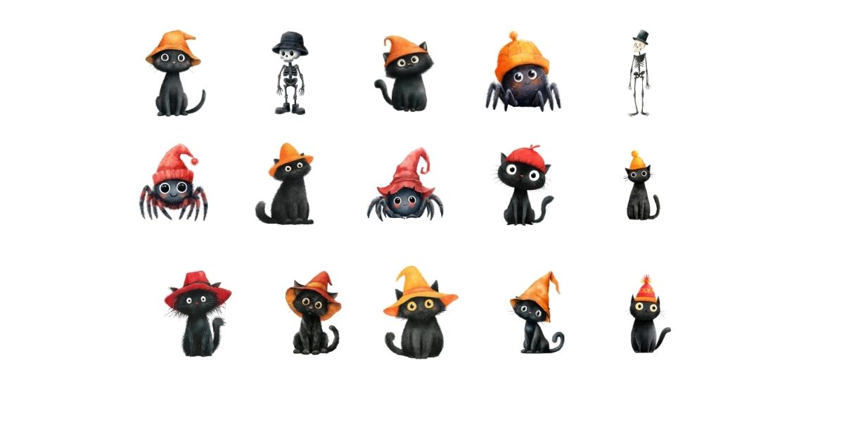 This is a set of 28 adorable spiders, skeletons, cats, and mummies, all wearing hats. These were designed in Midjourney.