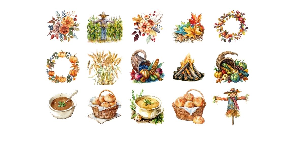 This set of 30 clipart images are beautifully designed by AI and comes with images like cornucopia, wreaths, dinner table, apple cider, rolls and more.